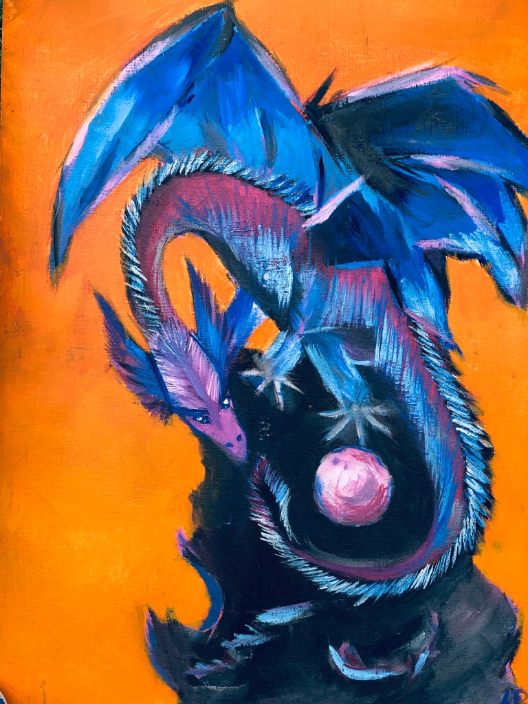 “At all cost” is an artwork that tells a small story. The dragon has been set with the task of protecting the orb at all cost. The bright, vibrant background is a representation of fire and burning with only the dragon, the orb and the rock left. This is also an oil painting, which I created by looking at a dragon figurine, when I was 12.