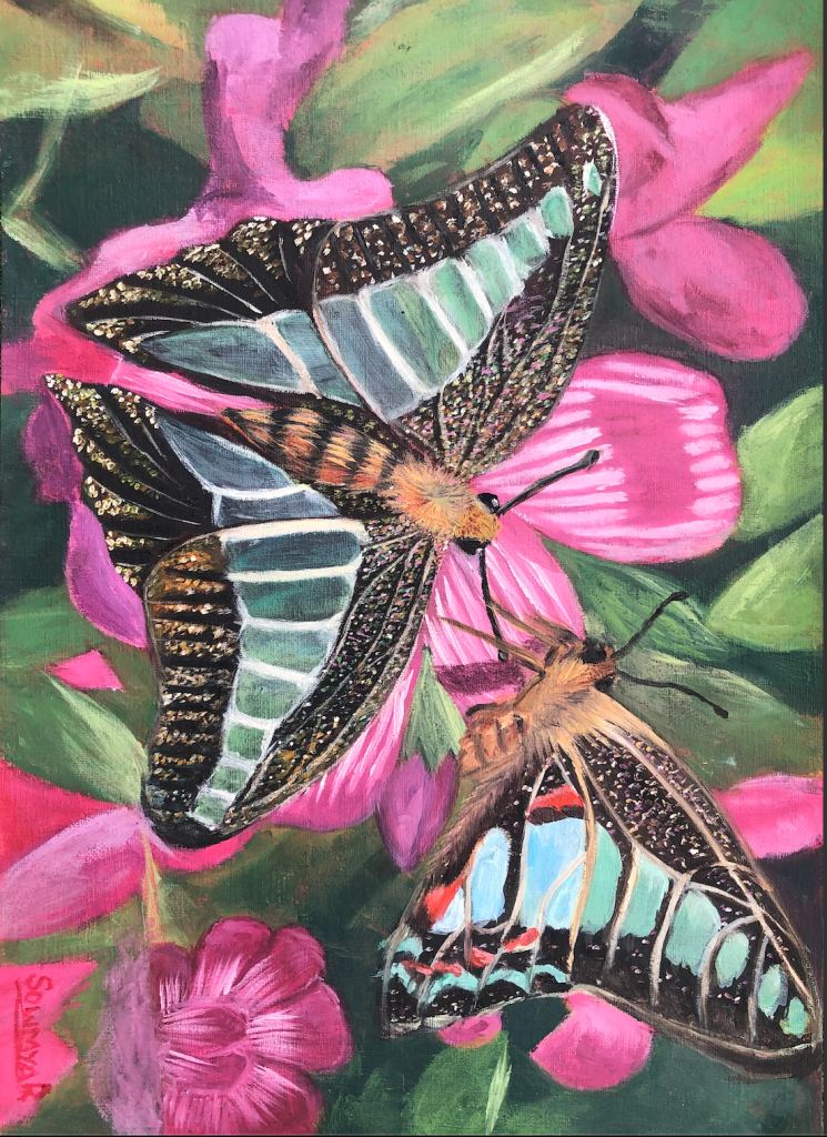 This was created 2 years ago, when I was 13, and is one of my first proper oil paintings. It took over 12 hours, as it required a lot of small details (especially on the wings). I had a lot of fun painting this, because I have always been fascinated by butterflies, and creating this, helped me understand more about their anatomy.