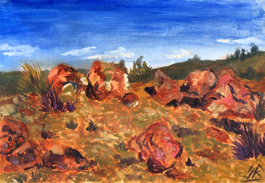 This is an oil painting based on a picture taken in a rocky scenery in Canberra. I painted this last year (when I was 14 years old). Each rock has a unique structure to it, with different textures and colours too. There was a lot of detail in the rocks such as the algae, cracks and shadows that were cast. This painting took a few hours and I enjoyed painting it.